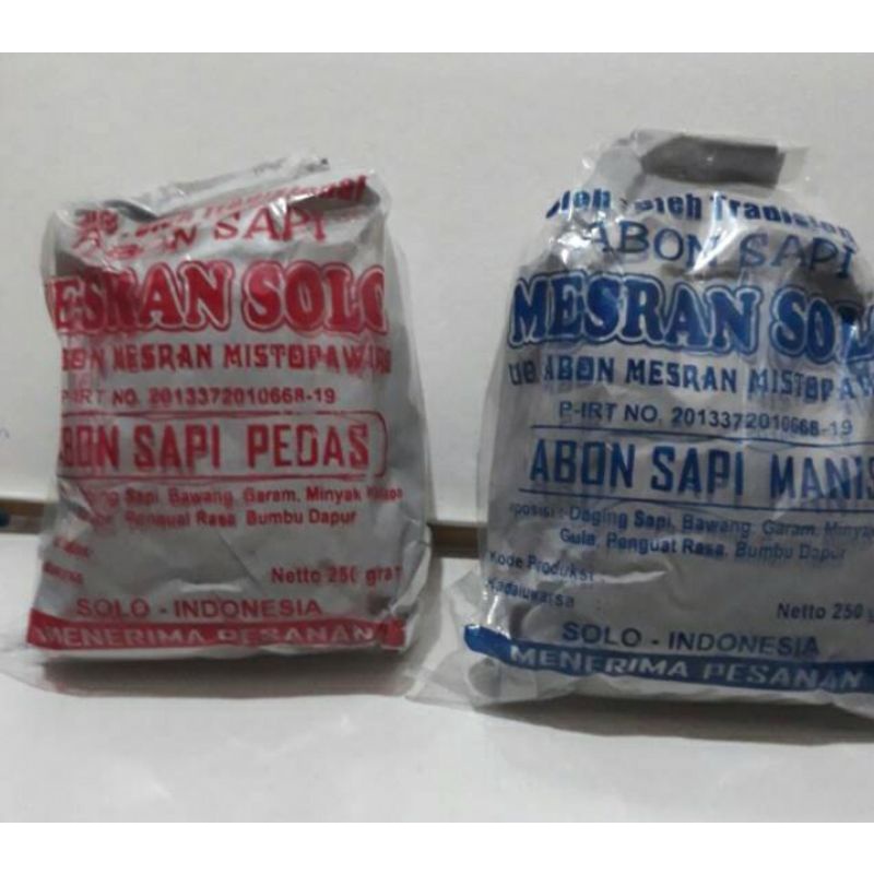 abon sapi di olah dng daging pilihan dan di padukan bumbu rempah shg tercipta abon sapi yg gurih lezat, dengan dua pilihan rasa manis dan pedas, isi 250gr/plastik.