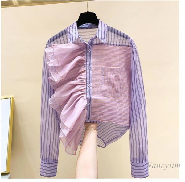 and 2020 autumn spring women's korean-style loose striped shirt new ruffle blouse fashion girls ladies blusas mujer de moda1, White