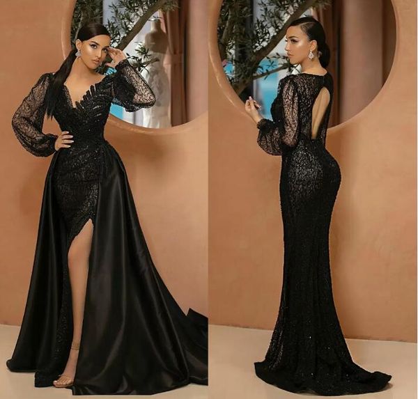 arabic black mermaid evening dresses with detachable train v neck lace sequins prom dress long sleeves luxury robe de soiree, Black;red