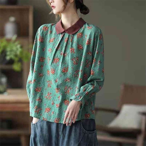 arrival summer arts style women loose casual turn-down collar t-shirt floral print flare sleeve cotton linen t shirt w158 210512, White