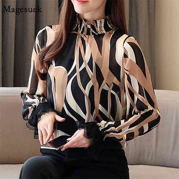 autumn chiffon slimming flare long sleeve blouse women loose print stand-up collar shirt pullover lace spliced shirts 11383 210518, White