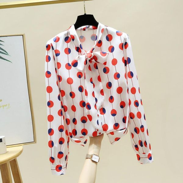 autumn korean style women's bow dot print long sleeves chiffon shirt female casual blouse ol shirts a4425 210428, White