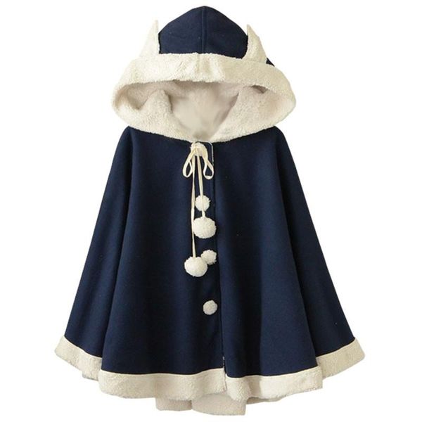 autumn winter japanese harajuku girl hooded cloak pink coat women loose cute ear wool jacket sweet batwing sleeve outwear women's jacke, Black;brown