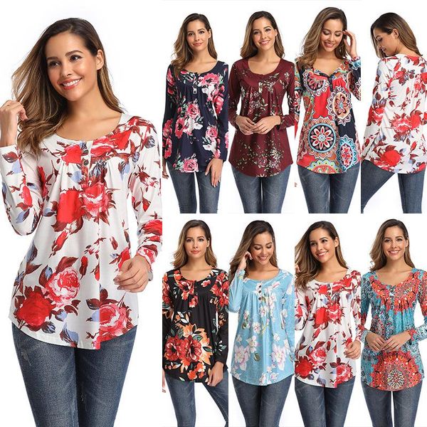 autumn and winter v-neck button pleating long sleeve printed loose-fitting casual t-shirt women's, White