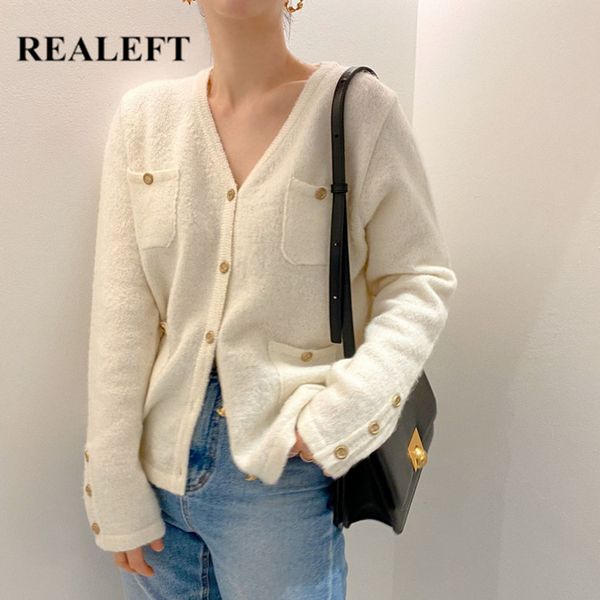 autumn winter white women's cardigans sweater pocket v-neck korean style buttons minimalism knitted sweaters 210428