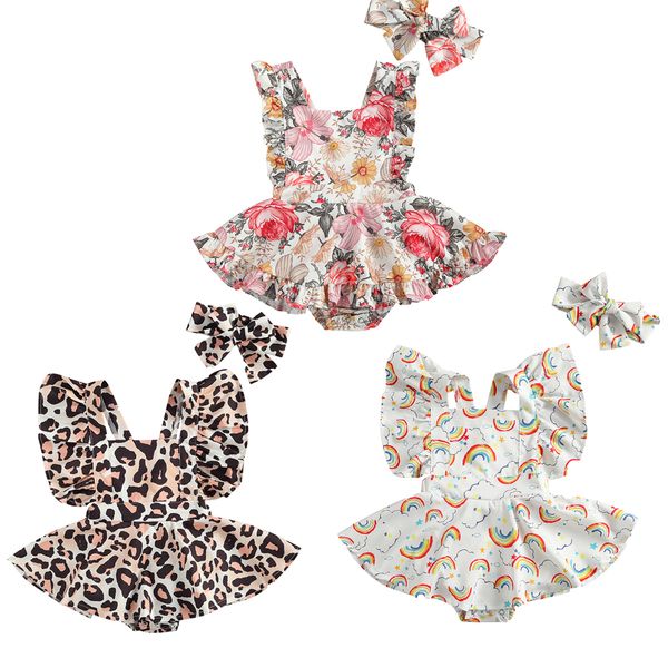 baby girls two-piece clothes set printed pattern sleeveless square collar romper + headdress white/ black, Blue