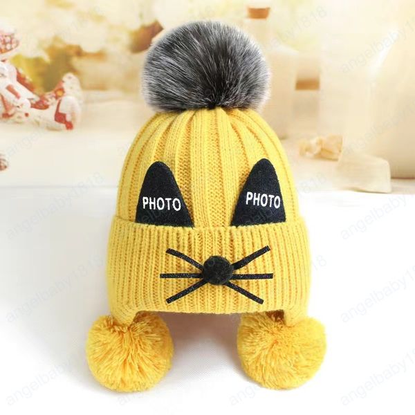 baby winter hat knitted beanies thick warm cap for girls boys fashion pompom ear caps cute patten kids bonnet cap, Yellow