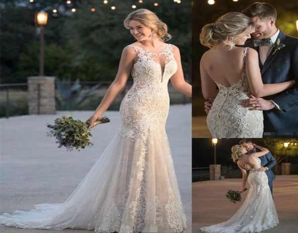backless summer beach wedding dresses straps lace applique tulle sweep train straps illusion mermaid wedding gown vestido de 2267521, White