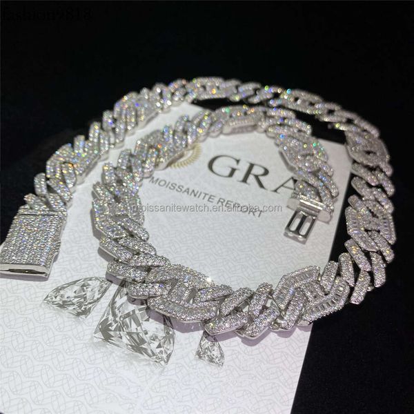 baguette moissanite jewelry gold plated hip hop men jewelry sier vvs moissanite 15mm cuban chain iced out cuban necklace, Silver