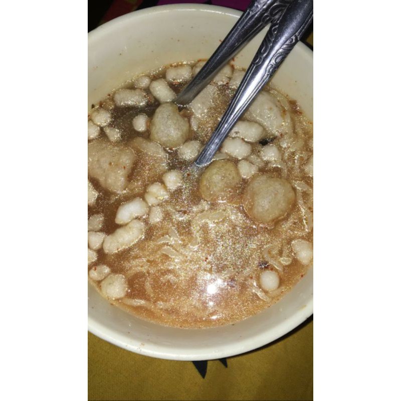 bakso Aci nya nih guys, isi bakso Aci : mie kuning, bakso sapi 2, baso Aci 4, pilus kencur, batagor kering, cuanki lidah, jeruk limau, bumbu penyedap, boncabe, sambel, bawang goreng, air kaldu daging.