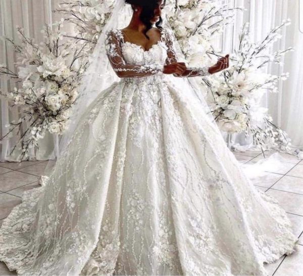 ball gown wedding dresses 2019 sweetheart neckline hand made flowers 3d flowers long sleeve puffy floor length bridal dresses5051906, White