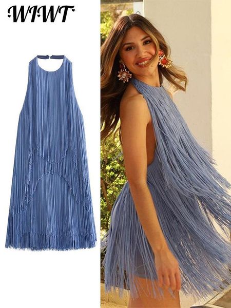 basic casual dresses backless tassels women mini dress blue loose halter sleeveless aline evening party female summer vestido 230724, Black;gray