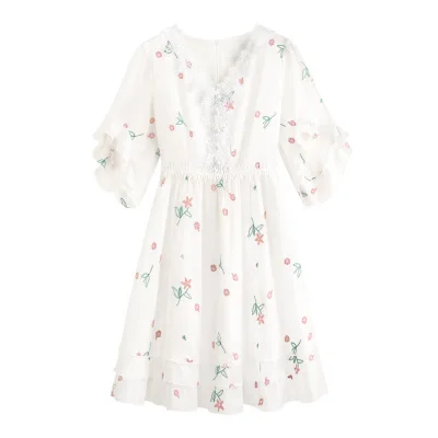 Chiffon Dress Summer New Women's Short Sleeve Embroidery Zipper Temperament High End V-Neck White Women's Dress