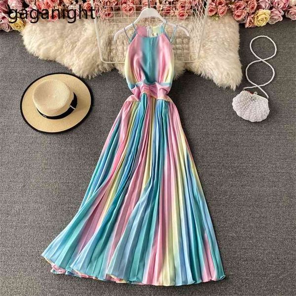 beach colorful striped women long dress sleeveless fashion summer ladies robe party vestidos casual pleated 210601, Black;gray