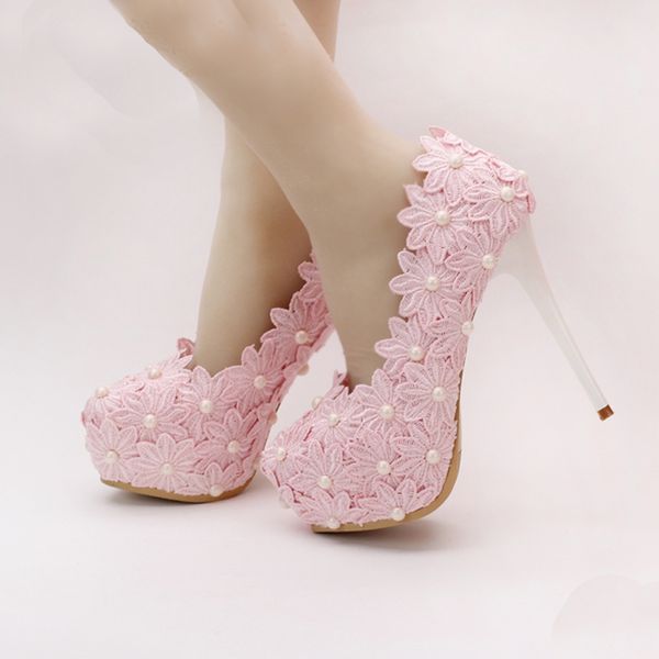 beautiful pink lace flower wedding shoes round toe women formal dress shoes high heel bridesmaid shoes prom party pumps, Black
