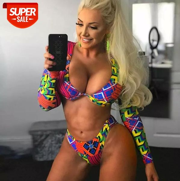 bikini 2021 female swimsuit women printed swimwear two-piece v shape wire bikini set long sleeve sun-proof bathing suit #0o6n, White;black