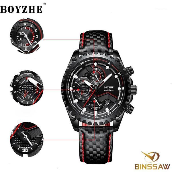 binssaw new automatic mechanical watch unique sports watch men leather strap clock waterproof mechanical1, Slivery;brown