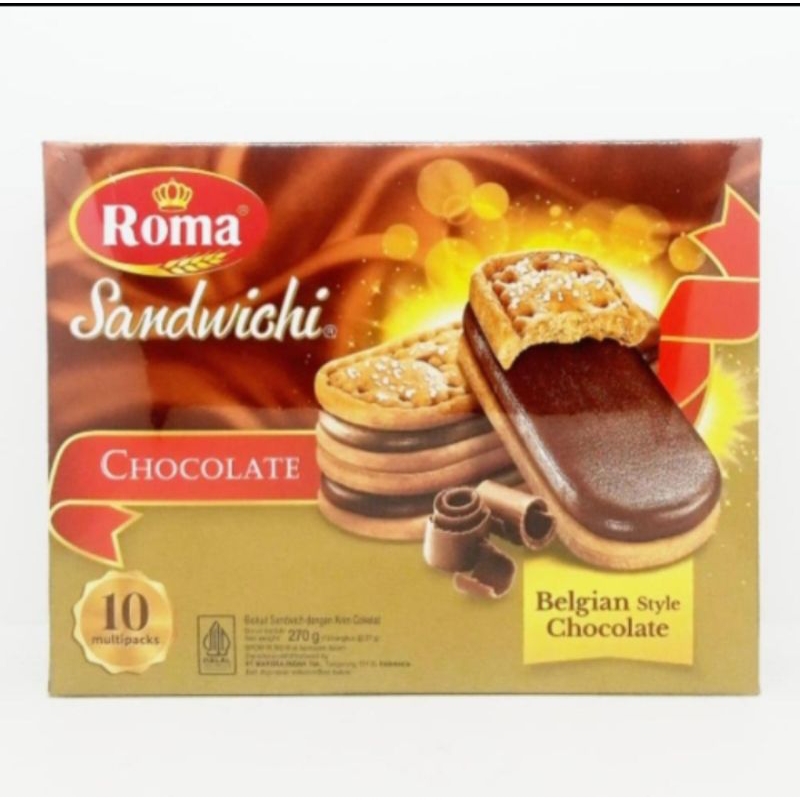 Roma Sandwichi Chocolate Box 270g merupakan Biskuit sandwich dengan krim cokelat belgian yang lezat dan renyah, isi 10 bungkus @ 27 g