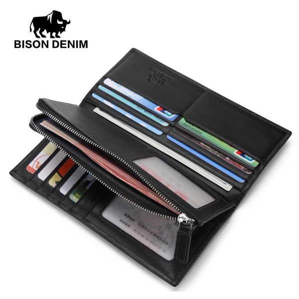 bison denim black cowskin men long wallet clutch purse genuine leather card & coin zipper pocket long purse for male, Red;black