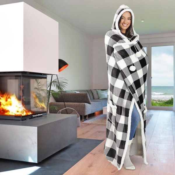 blankets hooded lazy blanket thicken and longer warm jacket red black plaid printed casual christmas home service clean