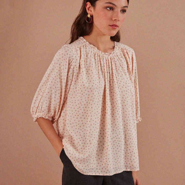 blouses ruffles shirt women half sleeve round collar buttons up floral print blouse cute shirts youth mujer chemisier femme cp16, White
