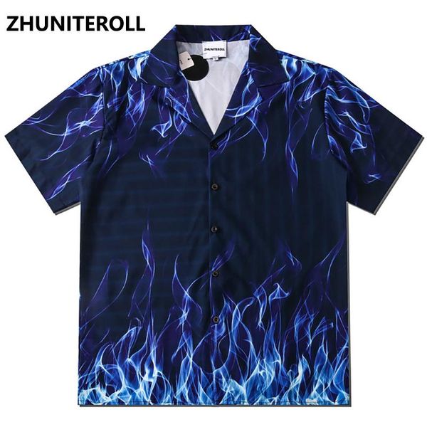 blue flame print shirts men streetwear hip hop mens hawaiian shirt harajuku summer beach hawaii short sleeve men's casual, White;black