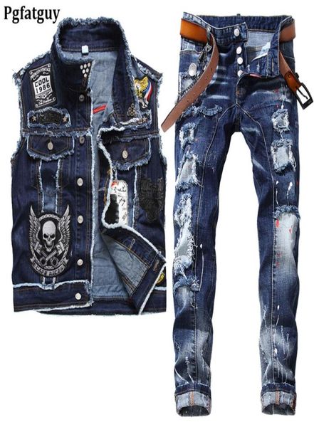 blue tracksuits men 2 pieces sets 2021 new slim casual embroidery skull denim vest and ragged paint patch stretch jeans conjuntos 8326065, Gray