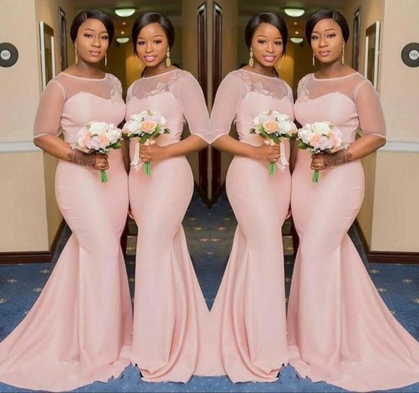 blush pink sheer jewel neck bridesmaid dresses 12 sleeve mermaid floor length black girls maid of honor gown wedding guest dress416183192, White;pink
