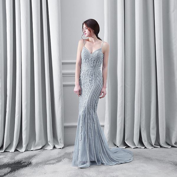 blush tulle spaghetti prom dresses custom v neck crystals evening sweep train sheath party gowns robe de mariée, Black