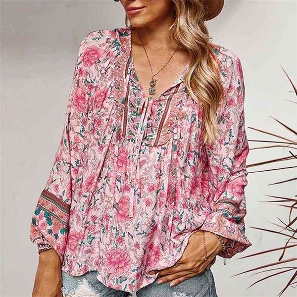 boho inspired long sleeve women blouse shirt floral print boho shirts tie v-neck pink women rayon spring summer blouse 210401, White