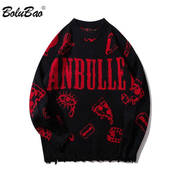 bolubao men streetwear hole knit sweater hip hop autumn pullover sweater o-neck oversize couple casual men's sweaters 211014, White;black