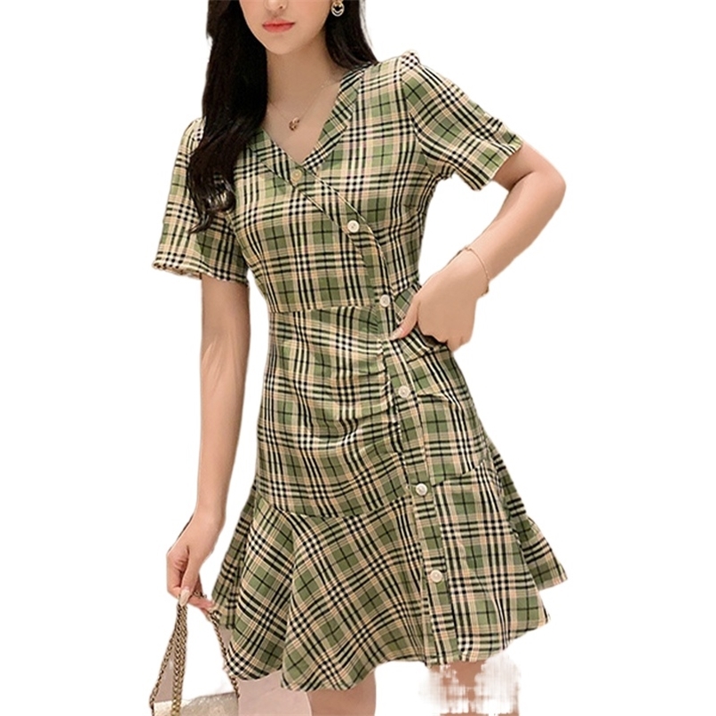 Fashion Women's Mini Dress Summer Temperament Plaid Skirt Short Sleeve For Women 210520, Green