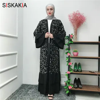 Siskakia Muslim Abaya Black Sequins Patchwork Double layer Flare Sleeve Ruffles Patchwork Cardigan Robes Fashion Ramadan Tunics