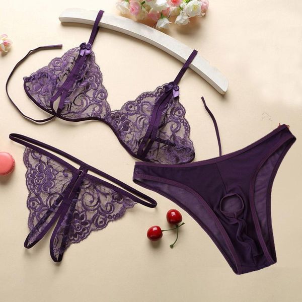 bras sets 3pcs lace bra set intimate women lingerie transparent bralette+open crotch thong underwear mesh erotic, Red;black