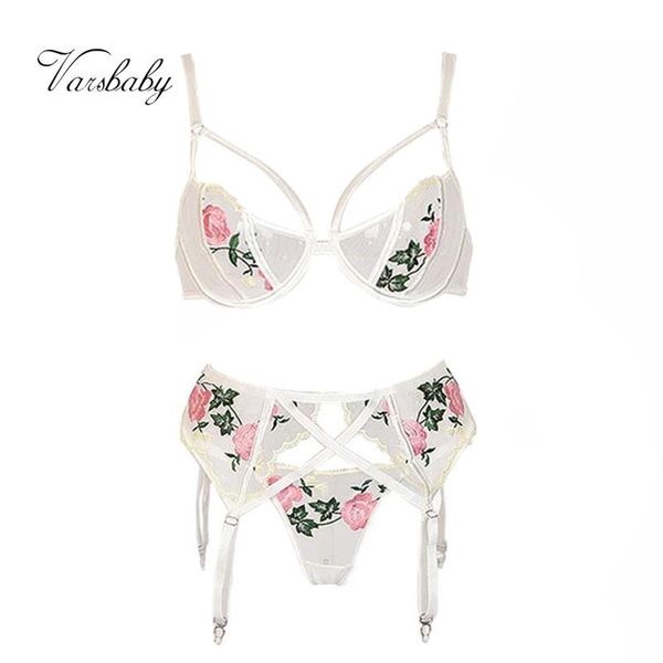 bras sets varsbaby rose embroidery three-piece transparent lace bra set, Red;black