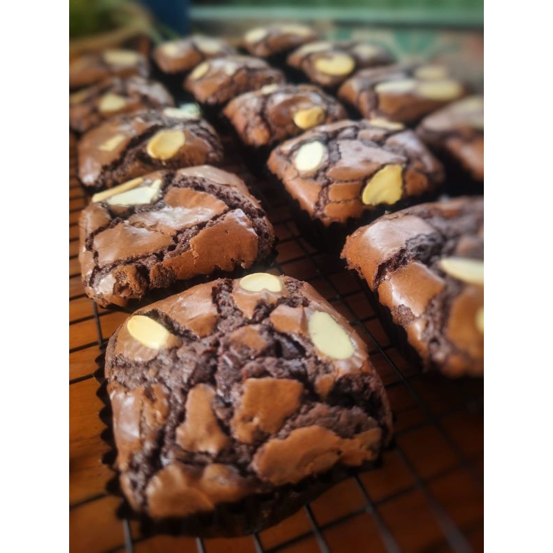 bronis panggang yang diletakkan di atas rak pendingin. Bronis ini memiliki permukaan yang retak-retak dengan tekstur yang terlihat lembut dan lembab. Di atas bronis terdapat potongan kacang almond yang tersebar merata, menambah tampilan yang menarik dan memberikan tekstur tambahan. Bronis ini tampak baru saja dipanggang dan dibiarkan dingin di atas rak pendingin. Warna cokelat gelap dari bronis menunjukkan bahwa mereka kaya akan cokelat, yang membuatnya terlihat sangat lezat dan menggugah selera.✨