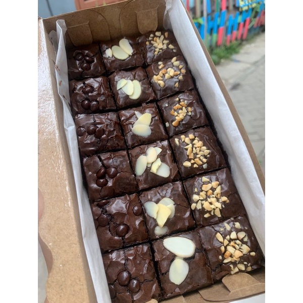 brownies fudgy dengan topping almond, kacang tanah dan choco chips. ukuran 20x10 ada 18 potongan kue dalam 1 box .