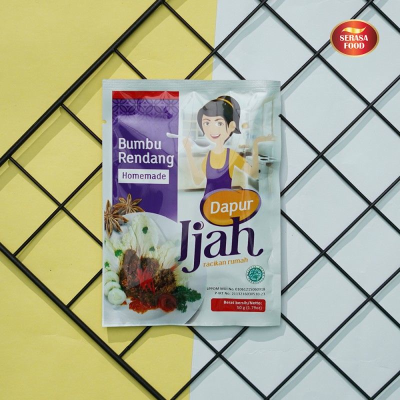 Dapur Ijah - Bumbu Rendang Bumbu Rendang instant yang dibuat dari bahan-bahan pilihan membuat masakan anda khususnya Rendang menjadi lebih sedap, harum, dan enak pastinya. Berat : 50gr Komposisi : Cabai, bawang merah, bawang putih, jahe, lengkuas, serai, kelapa gongseng, rempah rendang, garam, minyak goreng. Expired : 1 tahun Cara Membuat : Tumis bumbu rendan bersama 250 gram daging/ 400 gram ayam didalam 150 ml santan dari ½ butir kelapa, tambahkan daun kunyit dan daun jeruk, kemudian masak dengan api kecil hingga empuk dan kering (sesuai selera). Angkat dan siap untuk dihidangkan. Harga Jual Dapur Ijah - Bumbu Rendang - Rp 5.900