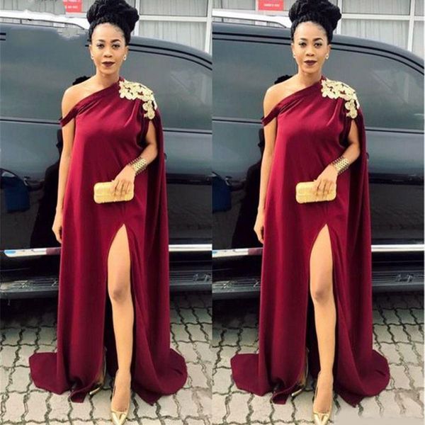 burgundy one shoulder evening dresses long gold lace appliques chiffon formal evening party dress for women with split slit, Black;red