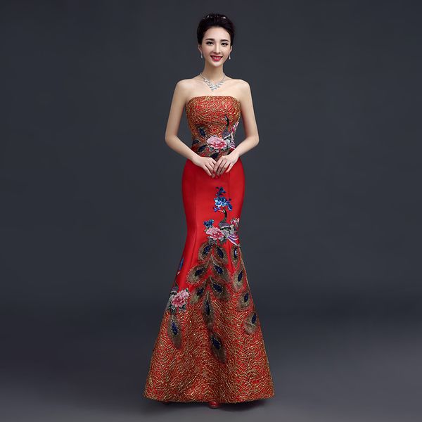 burgundy peacock appliques wedding party dress fishtail slim chinese bride wedding dress off shoulder evening, Red