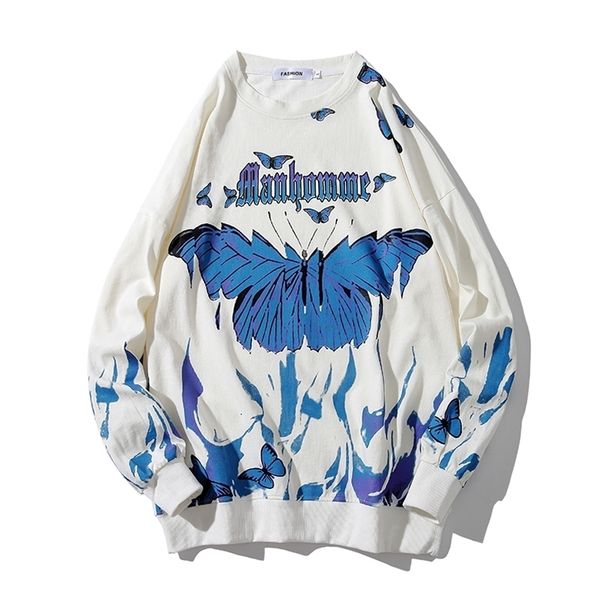 butterfly fire flame print sweatshrit men streetwear hip hop casual long sleeve pullover men harajuku hipster fashion 201201, Black