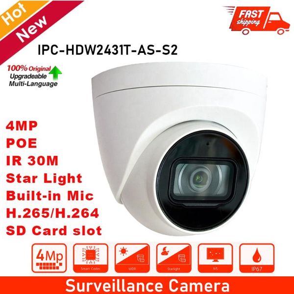 cameras orginal dh ipc-hdw2431t-as-s2 4mp hd poe ir starlight dome camera built in mic sd card slot h.265 ip67 30m