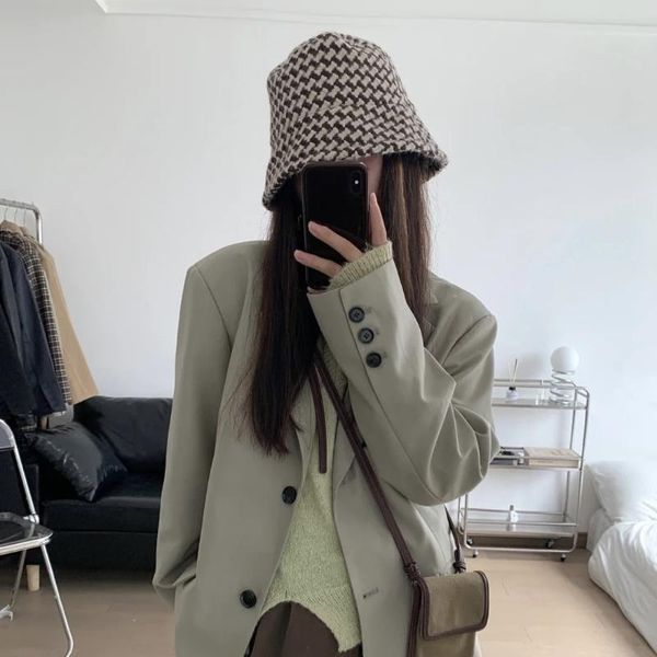 caps & hats black and white lattice bucket hat female autumn winter coarse linen knitted warm fisherman net red cover face versatile, Yellow