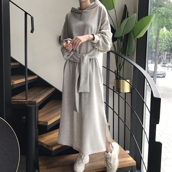 casual dresses autumn 2021 ladies sweet pure color simple hooded sashes high waist long sleeve with split ends dress robe, Black;gray