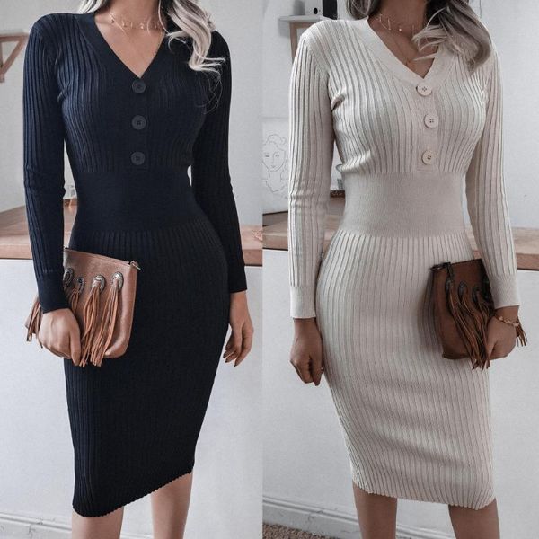 casual dresses autumn and winter button v-neck long sleeve knitted sweater dress women solid color bandage elegant vestidos, Black;gray