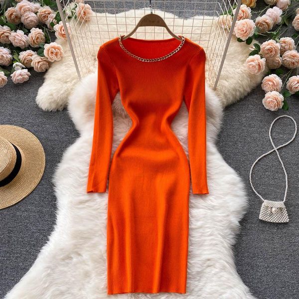 casual dresses autumn winter metal chain long sweater dress women pink bodycon thick female jumper o-neck slim basic knit sleeve, Black;gray