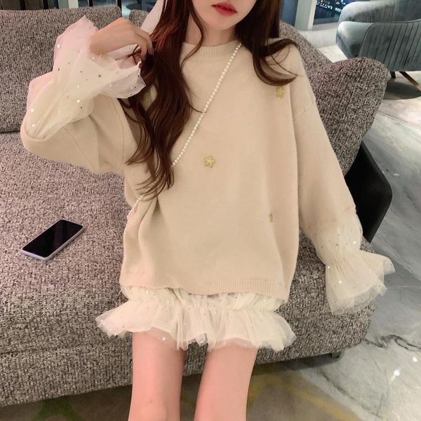 casual dresses autumn women dress sweet preppy style knitted sweater patchwork mesh female bing embroidery 2021, Black;gray