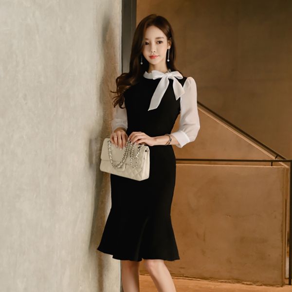 casual dresses black one piece dress for women summer korea fashion long sleeve crew neck white lace sundress patchwork party, Black;gray