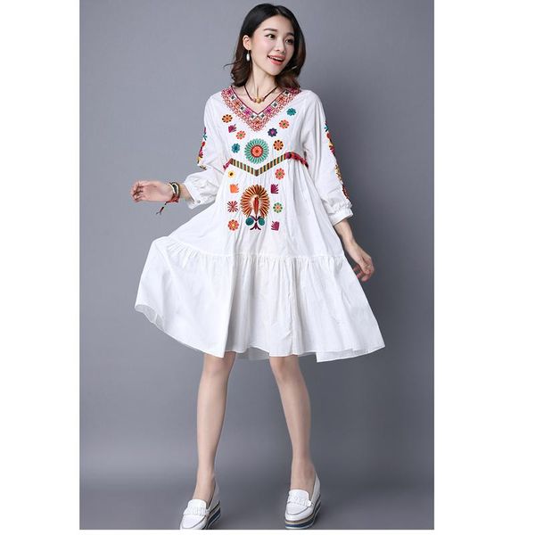casual dresses bohemian sweet flower embroidery lantern sleeve v-neck knee-length 100% cotton dress female a-line white orange blue, Black;gray