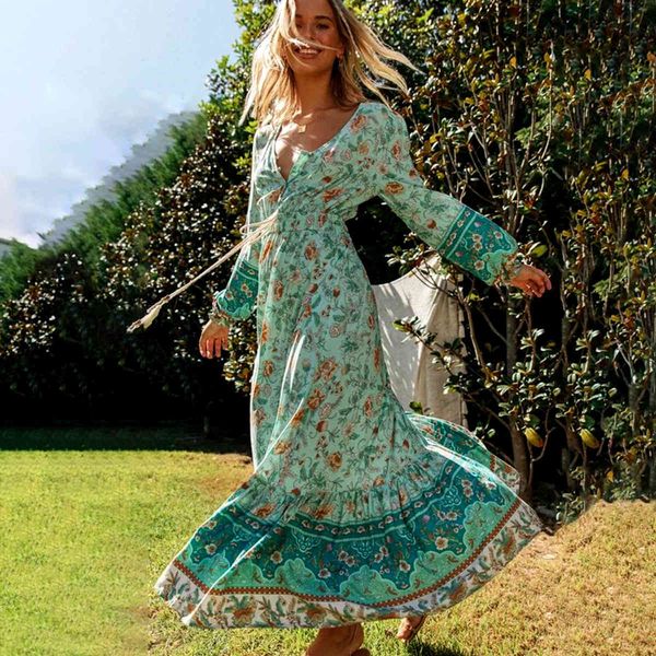 casual dresses boho floral print women long sleeve spring maxi hippie chic adjusted waist v-neck dress beach vestidos glxx, Black;gray